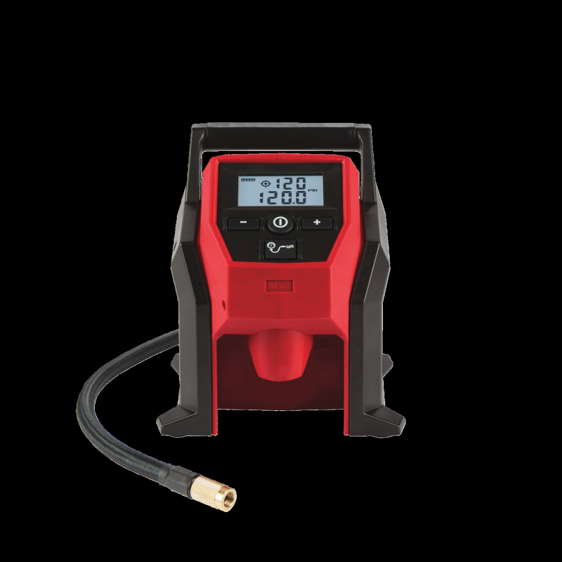 Diseño ligero y compacto para inflar rápidamente neumáticos de coches, furgonetas y otros equipamientos con neumáticos | Motor y bomba eficiente | Pies con antivibración engomados para que no se mueva el inflador durante el hinchado | Tecnología de inflado con parada automática, el usuario preselecciona la presión y automáticamente se para al llegar al nivel con gran precisión | Pantalla LCD iluminada con indicador de presión digital y carga que muestra la carga restante en la batería | Zona de almacenaje para la boquillas y manguera de 66cm. Boquilla con rosca totalmente de latón | Las baterías REDLITHIUM™, con una construcción robusta, son capaces de ofrecer un rendimiento constante gracias a su electrónica, con mayor autonomía y más capacidad de trabajo durante toda su vida (batería vendida por separado) | Sistema flexible de batería: funciona con todas las baterías MILWAUKEE® M12™ | Suministrado con aguja de balón, boquilla Presta, boquilla de inflado y boquilla Schrader