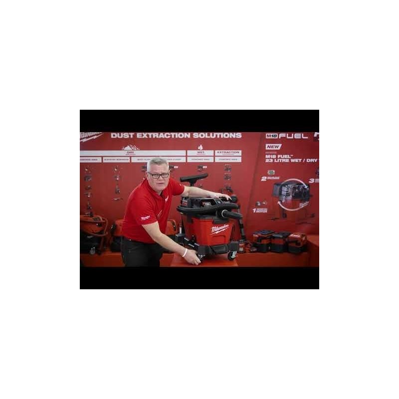 El aspirador de polvo M18 FUEL™ de 23l, clase L aporta un rendimiento, una durabilidad y una versatilidad inigualables en la limpieza del lugar de trabajo | Con un volumen máximo de aire de 3.086l/min y una máxima potencia de aspiración de 157mbar, ofrece un excelente rendimiento para aplicaciones de limpieza en seco y en húmedo | El modo de potencia máxima ofrece hasta 34 minutos de tiempo de limpieza continua (hasta 480m²) y hasta 49 minutos (hasta 545m²) en el modo de autonomía máxima por carga con (2) baterías M18™ REDLITHIUM™ HIGH OUTPUT™ de 12.0Ah | El filtro HEPA H13 de alta eficacia recoge el 99,97% de las partículas suspendidas en el aire de hasta 0,3 micras | La manguera antiestática de 2,7m de longitud, resiste al aplastamiento y a la torsión, ofreciendo una mayor vida útil | Almacenamiento integrado para todos los acoplamientos, incluido el kit de limpieza de suelo y los accesorios | El robusto carro desmontable con ruedas bloqueables permite un fácil transporte y desplazamiento por el lugar de trabajo | El conector para herramientas eléctricas DEK 26 permite una extracción eficaz del polvo durante la aplicación cuando se trabaja con herramientas a batería | El ADN de nuestro sistema FUEL™ redefine el equilibrio de las tecnologías a batería. El motor sin escobillas MILWAUKEE® POWERSTATE™, la batería REDLITHIUM™ y la electrónica REDLINK PLUS™ ofrecen potencia, autonomía y durabilidad sin igual | Sistema flexible de baterías: funciona con todas las baterías M18™ de MILWAUKEE®