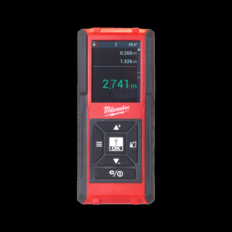 Fácil de usar por una persona, sistema de apuntar y medir | IP54: protección frente al agua y al polvo | Unidades de medida: métrica e imperial | Todos los botones de medición a mano, tanto en el frente como en el lateral de la carcasa | Ofrece varias funciones de medición diferentes que permiten a los usuarios sumar y restar valores, calcular la distancia lineal, perímetro, área total y volumen | Autonivelación digital que permite tomar la medida automáticamente cuando el medidor alcanza una posición de nivel (0°), aumentando la precisión cuando estamos midiendo largas distancias | Medición fácil de altura y longitud indirecta mediante la característica de autonivelado para mejorar la comodidad del usuario en situaciones de medición difíciles | Gran pantalla de 3 líneas de 50mm de diámetro. Pantalla LCD multicolor para una visibilidad optimizada | La pantalla muestra las tres últimas mediciones y el historial muestra las últimas 30 mediciones | Bisagra plegable de 3 posiciones incorporada para fácil medición en esquina / borde | Función de autoapagado e indicador de batería baja | Carcasa delgada para una fácil manipulación y bolsa de transporte de nailon para un transporte seguro